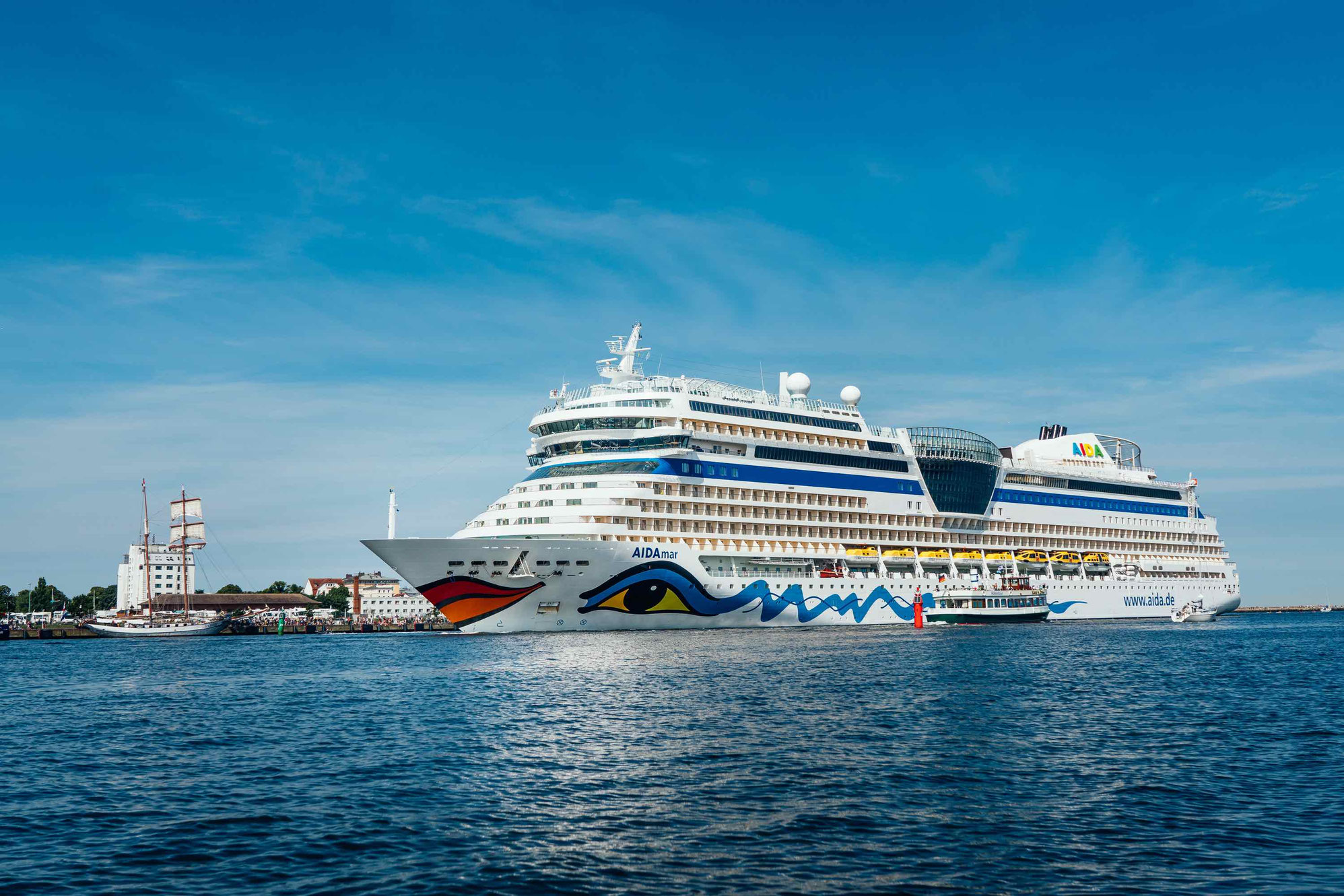 Als erstes Kreuzfahrtschiff passierte AIDAmar am Samstag, den 18. Juli 2020, gegen 11:00 Uhr die Leuchtfeuer der Hafeneinfahrt von Rostock-Warnemünde. Das Schwesterschiff AIDAblu wurde um 15:00 Uhr von zahlreichen Besuchern des Ostseebades begrüßt